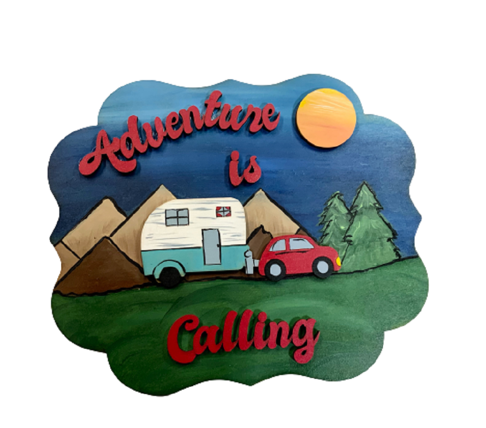 3D Design By Line Scalloped Plaque MDF Cutout Adventure Is Calling Camper And Car Scene With Mountains - Unfinished For DIY