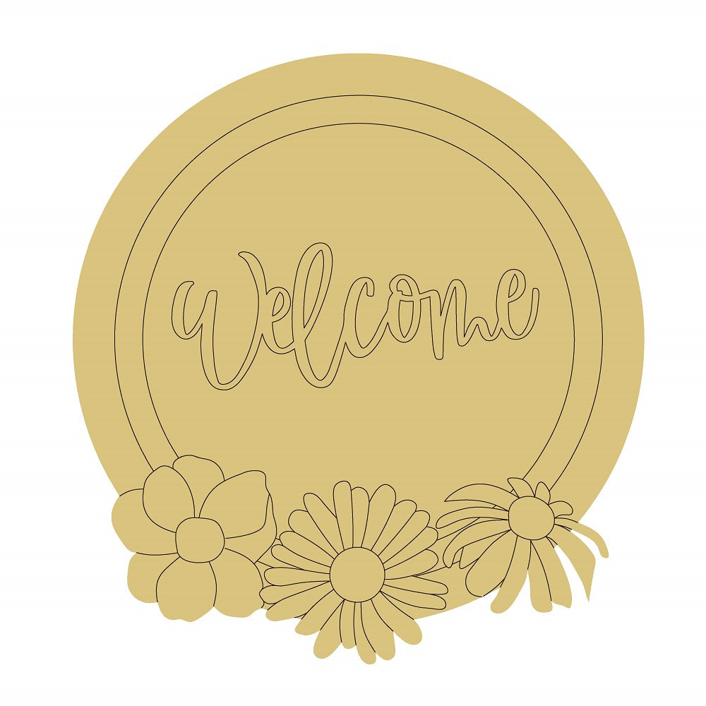 Design By Line Round MDF Cutout Welcome With Flowers - Unfinished For DIY